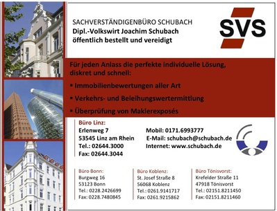 Suche|SVS| Bonn| Koblenz| Krefeld| Köln| Immobilienbewertung| Unternehmensbewertung| Betriebsunterbrechung| Wohnung| Haus| Unternehmen| Gutachten| öbuv|
